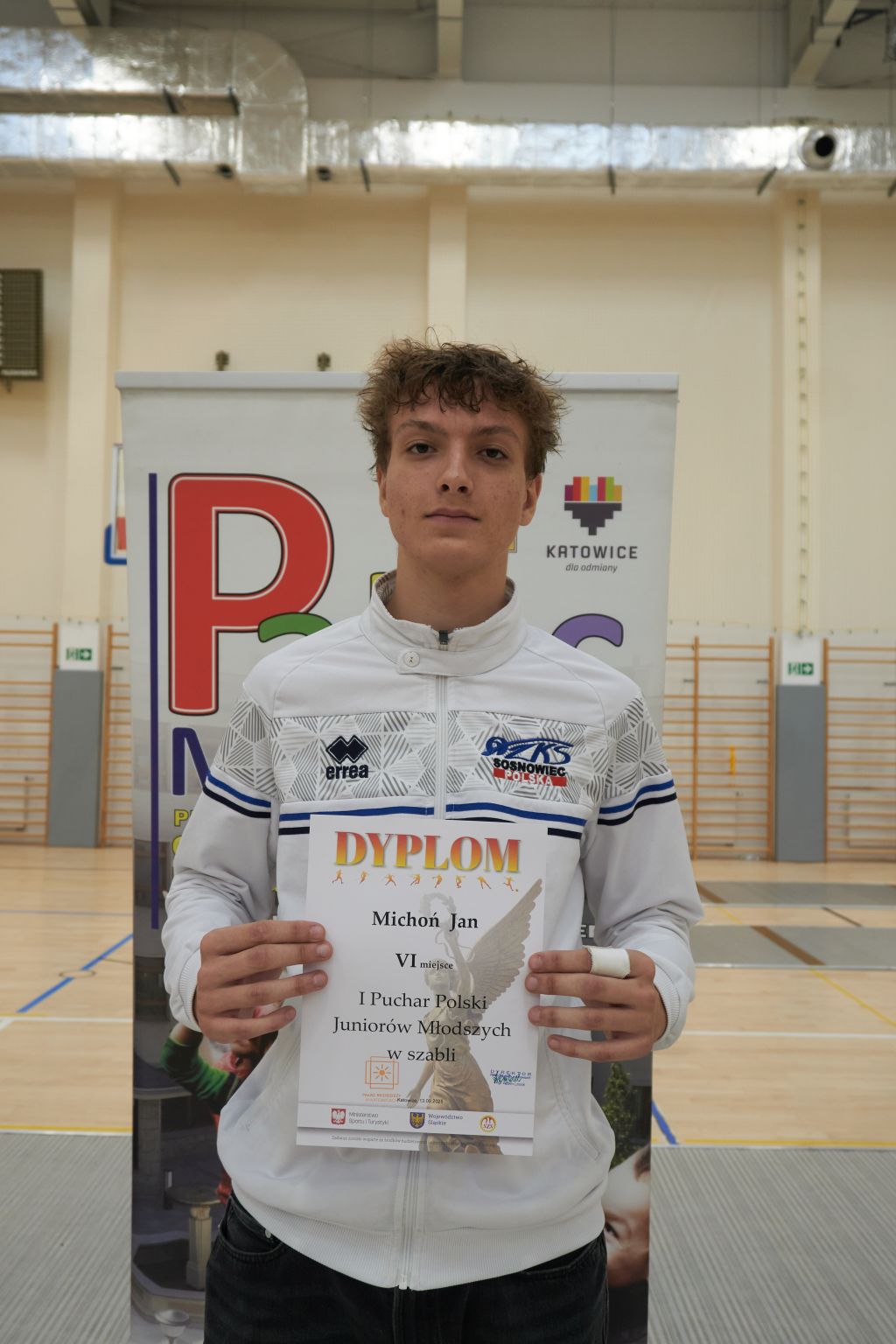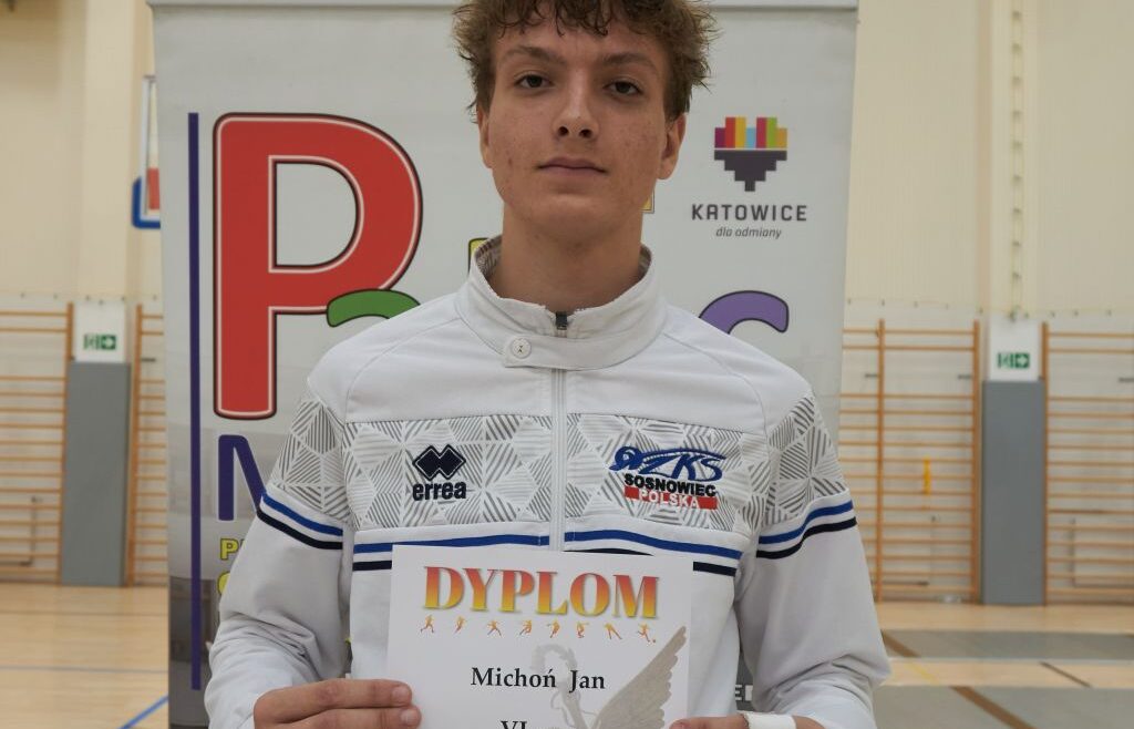 Jan Michoń, uczeń klasy 3D i zawodnik Zagłębiowskiego Klubu Szermierczego, po fazie eliminacji grupowej 1. Pucharu Polski Juniorów Młodszych, uplasował się na 3. miejscu, po czym wygrawszy trzy kolejne pojedynki, awansował do pierwszej ósemki zawodów. Przegrana, po zaciętej walce z kolegą z klubu, 15-10 w ćwierćfinale, przyniosła Jankowi ostatecznie wysokie, 6. miejsce. Zawody odbyły się w Katowicach w dniu 13 IX 2025 r. Wielkie brawa dla Janka.